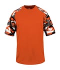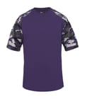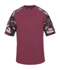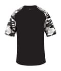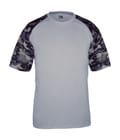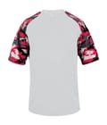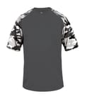 Camo youth sport tee designed with sublimated shoulder panels and sleeves for contrast styling, plus moisture management and odor protection to keep teams comfortable.